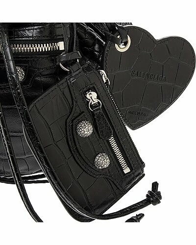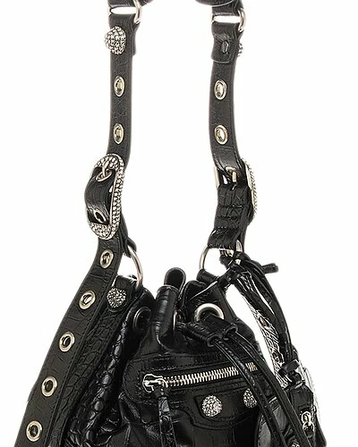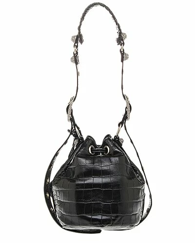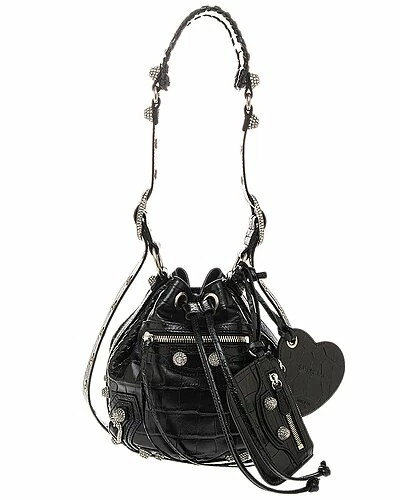 - Le Cagole Leather Bucket Bag in black leather and aged-silver hardware with front zip pocket