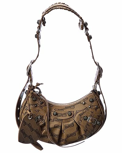 - Le Cagole XS Leather Shoulder Bag in khaki logo-printed leather and palladium metal hardware with exterior pockets, zippered pouch and heart mirror