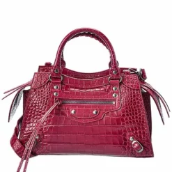 - Neo Classic Small Croc-Embossed Leather Shoulder Bag in raspberry croc-embossed leather and palladium metal hardware with zippered pocket